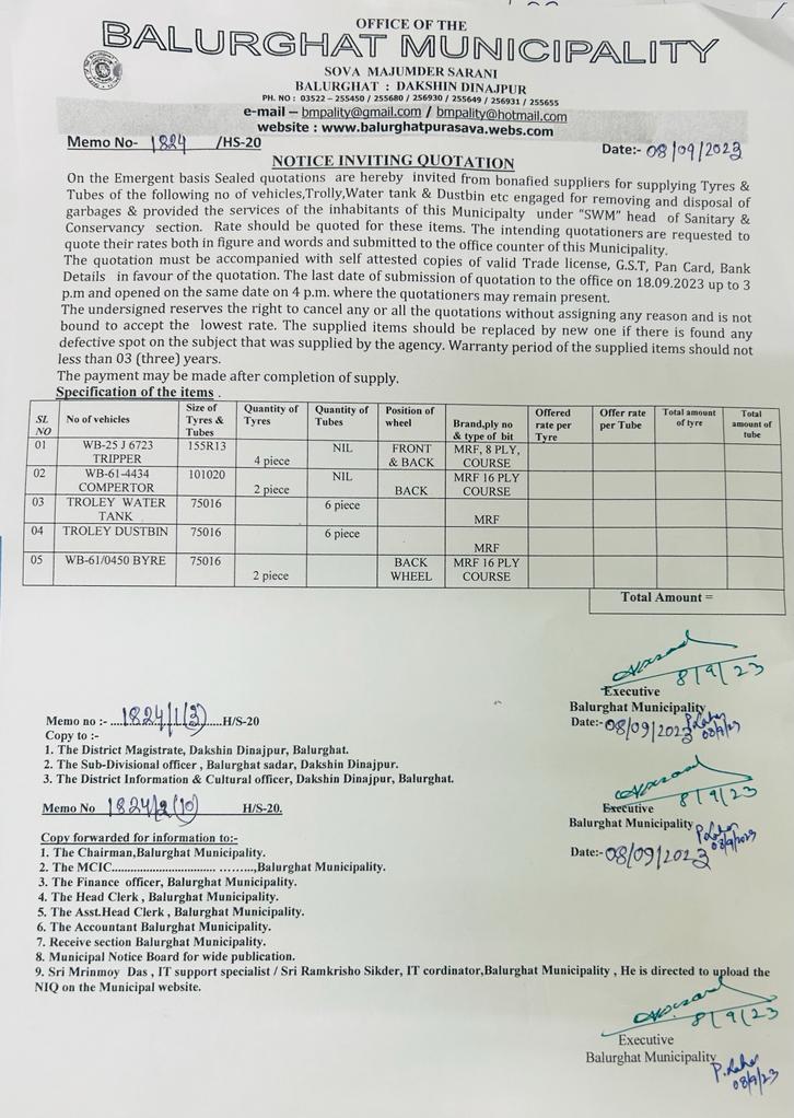 NIQ for Supplying of 4 no of tyre & Tube with Flap for back wheel Compactor-2 bearing No. WB61A/4435 of Sanitary & Conservancy Section under Balurghat Municipality.