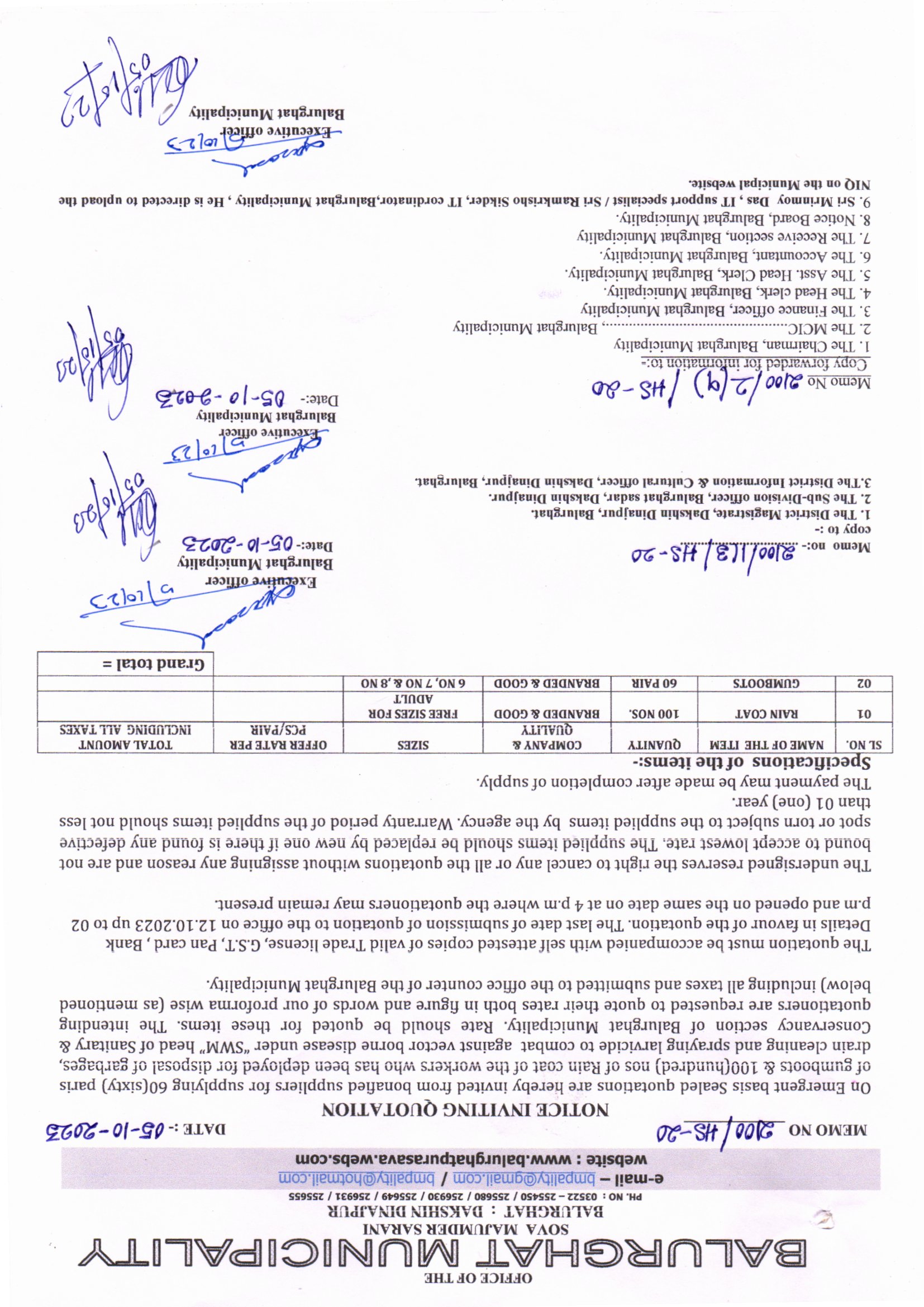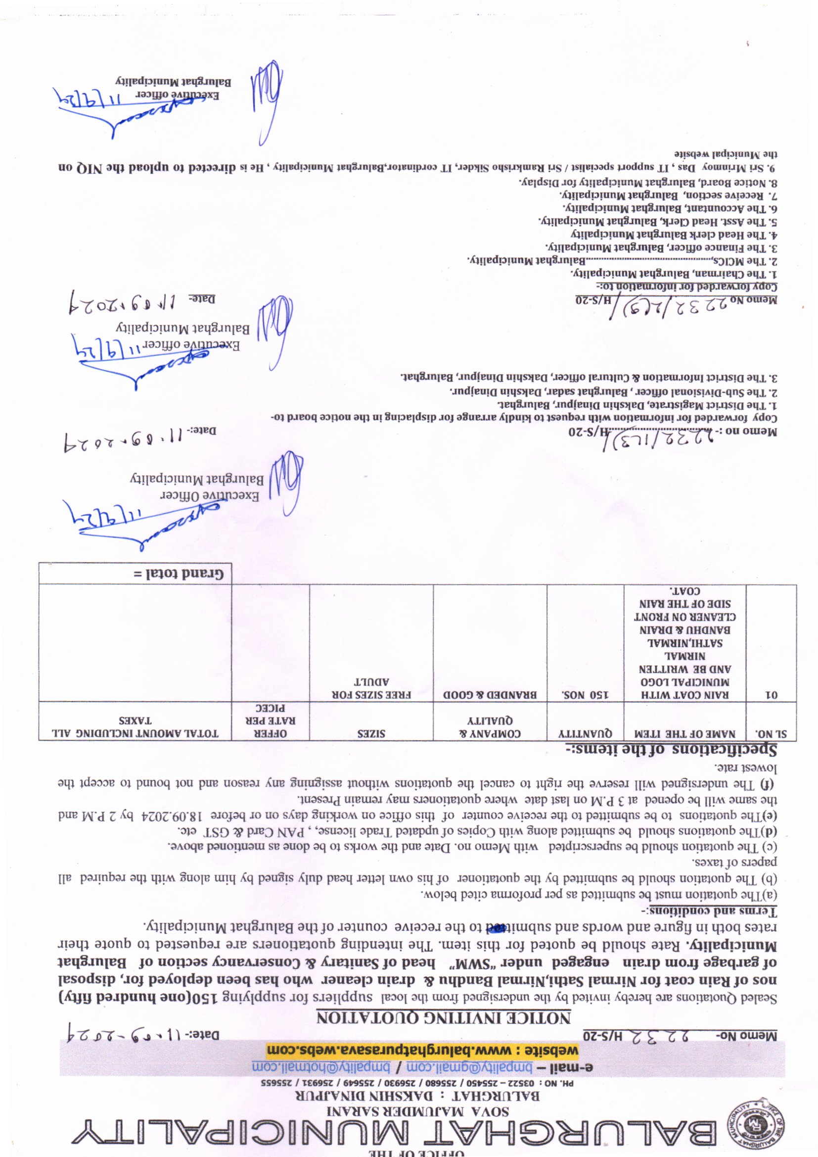 NIQ for Supply of 150 nos. Rain Coat under Balurghat Municipality Memo No. 2232/HS-20 Dt. 11.09.2024