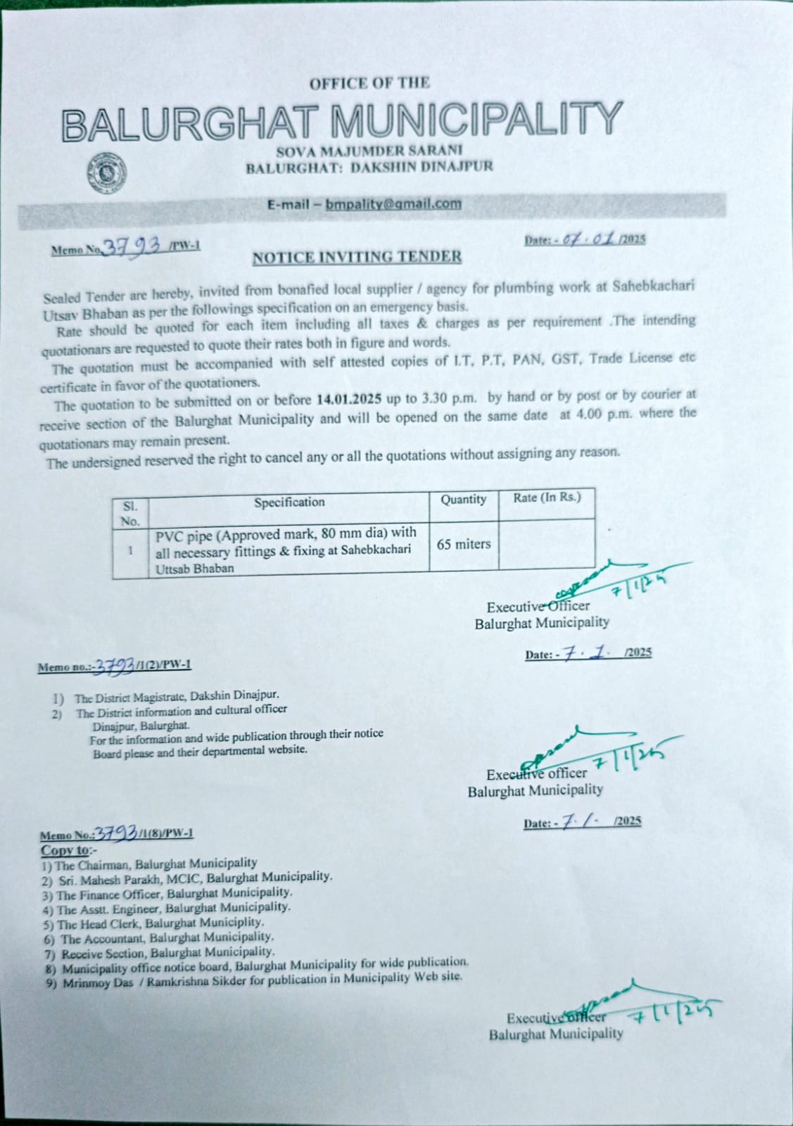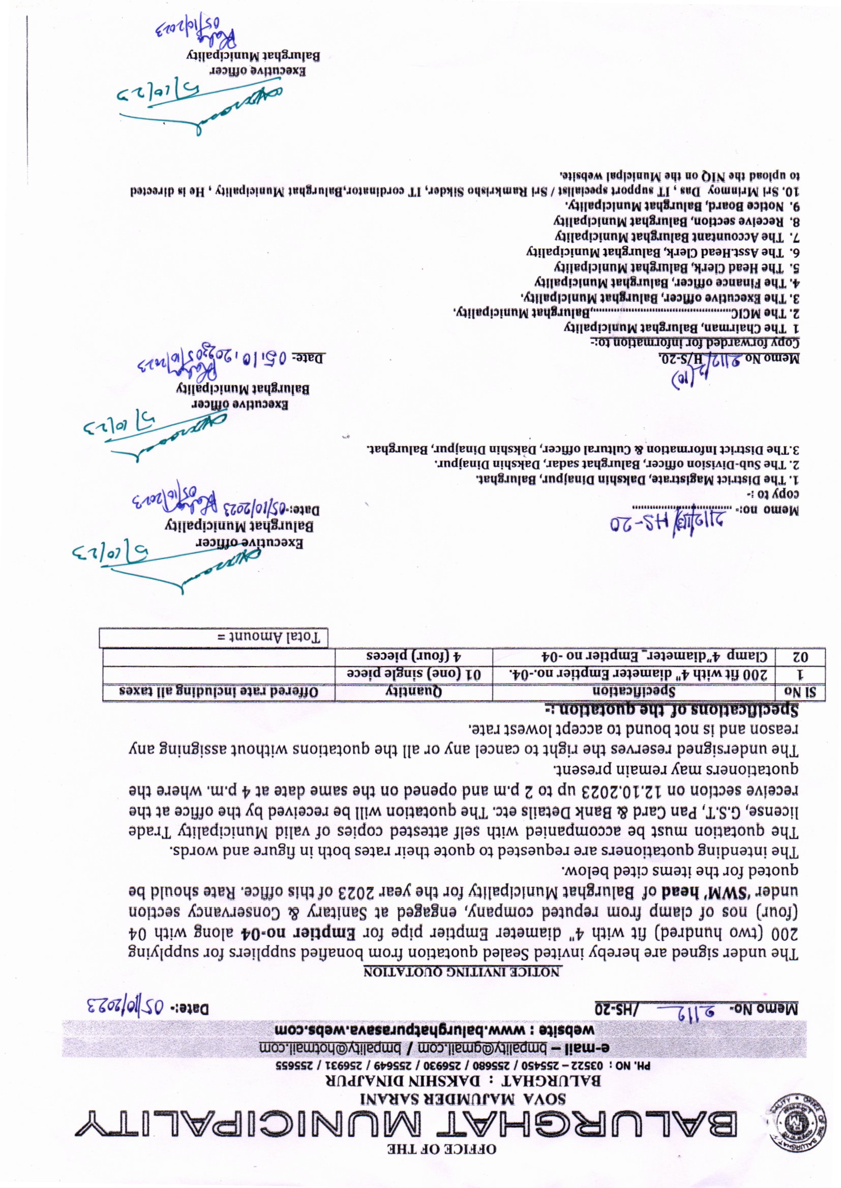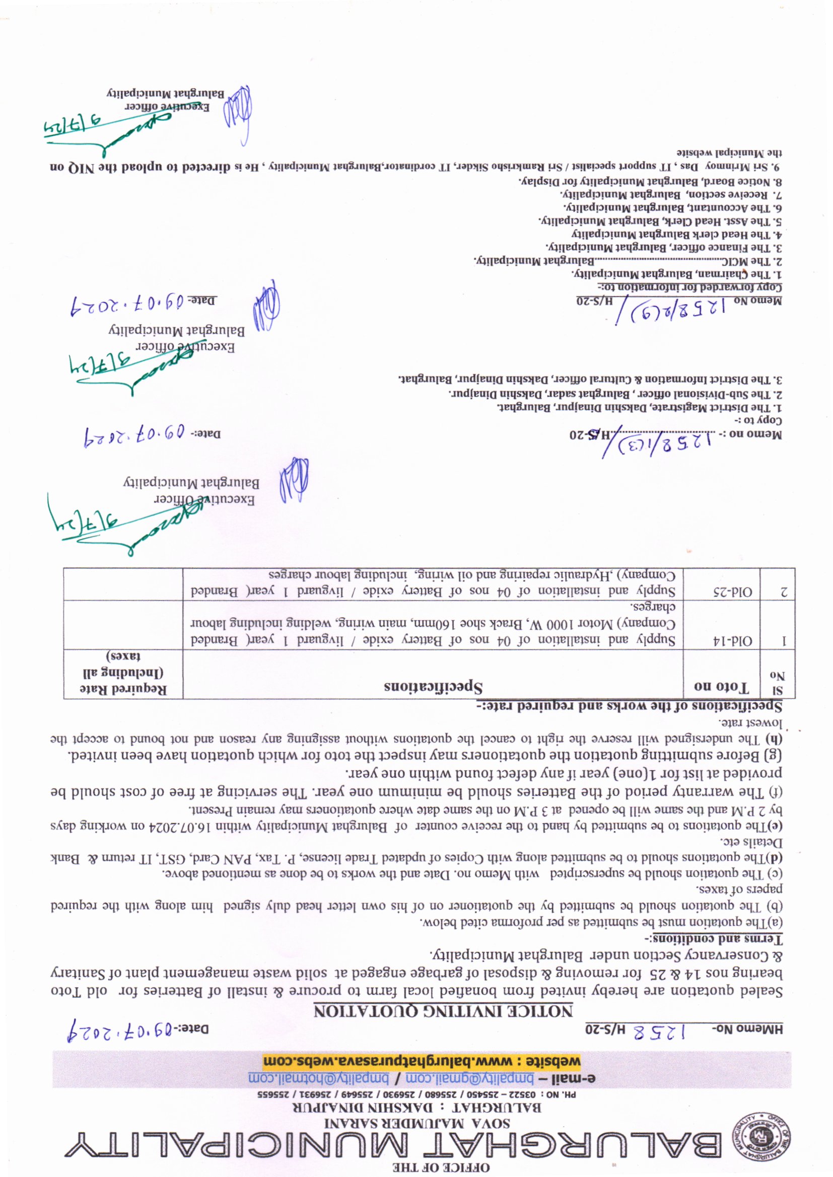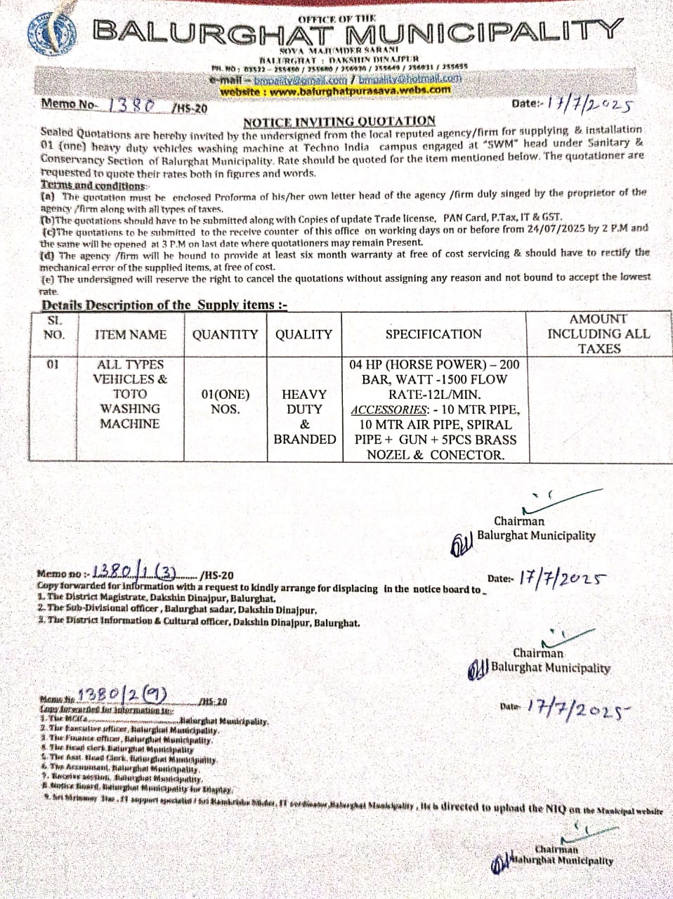 Memo No. 2075/HS-20 Dt. 04.09.2025 Procurement of vehicle parts at SWm Head under Balurghat Municipality