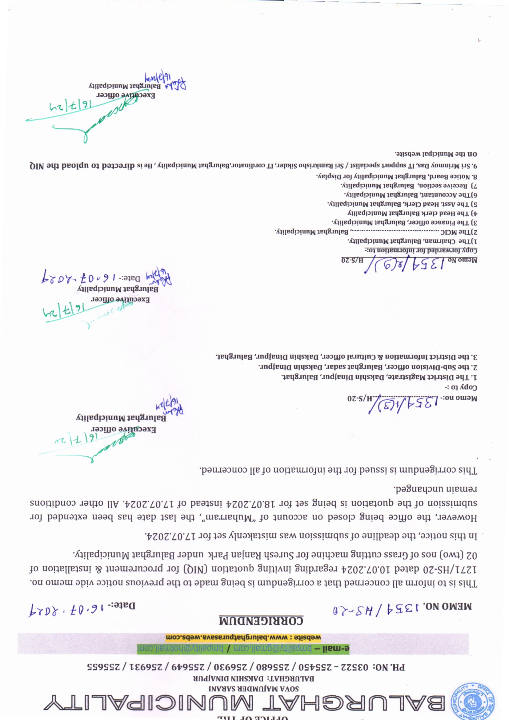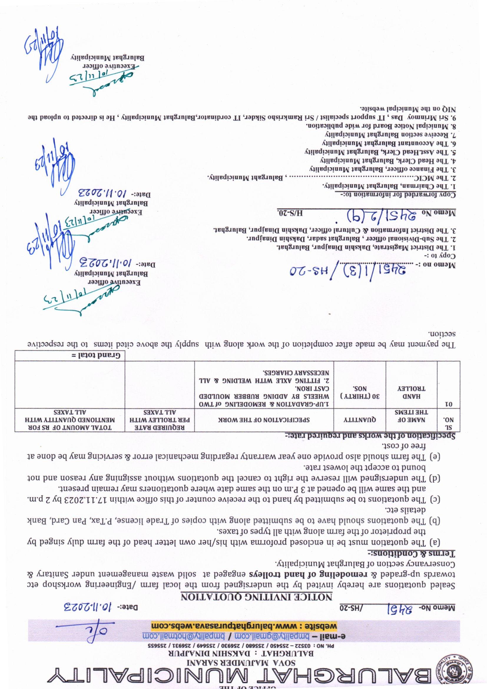 NIQ for supplying of two Nos. of Xerox Cum Printer for Sanitary and Conservancy Section and chamber of the Executive Officer, Balurghat Municipality