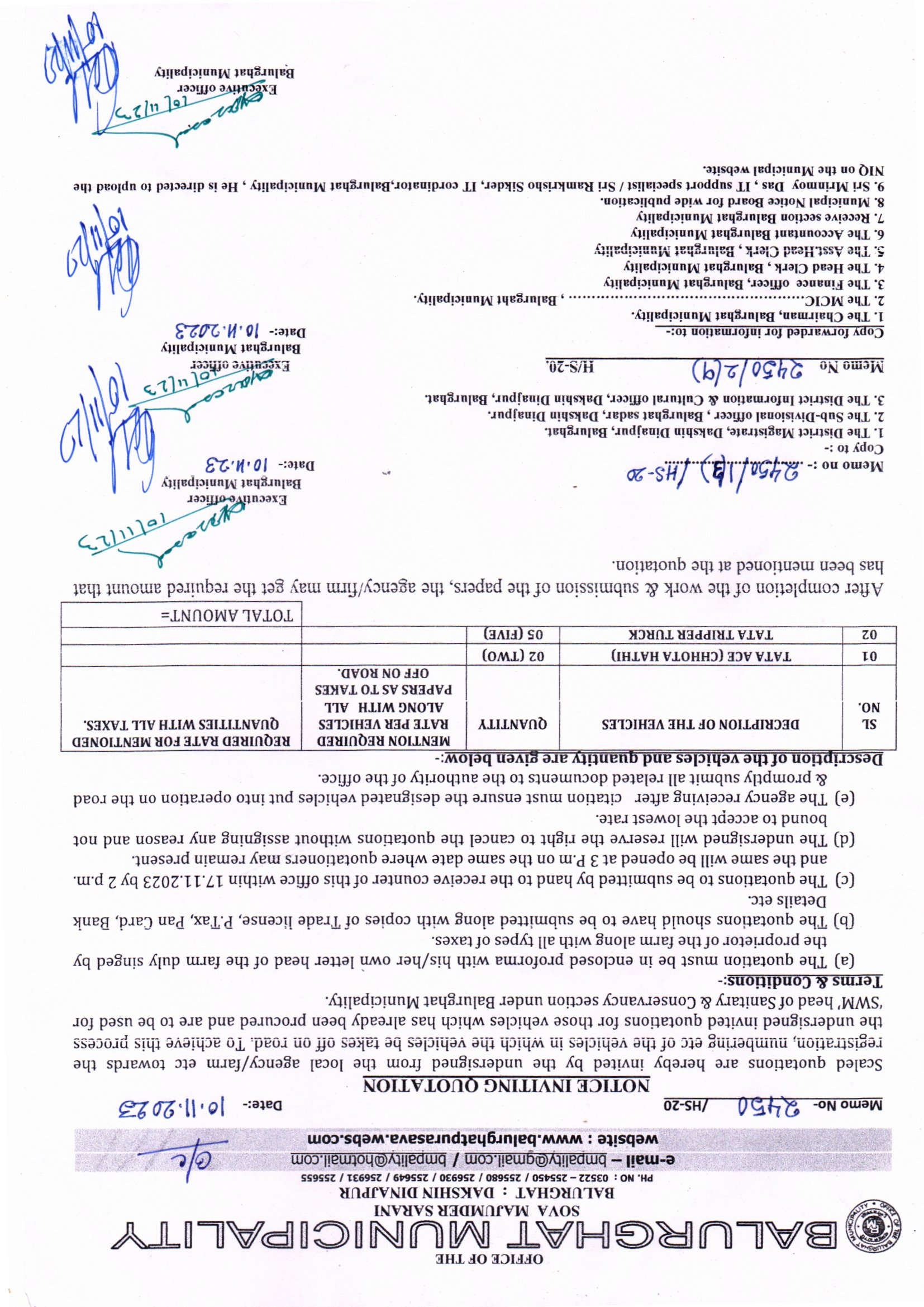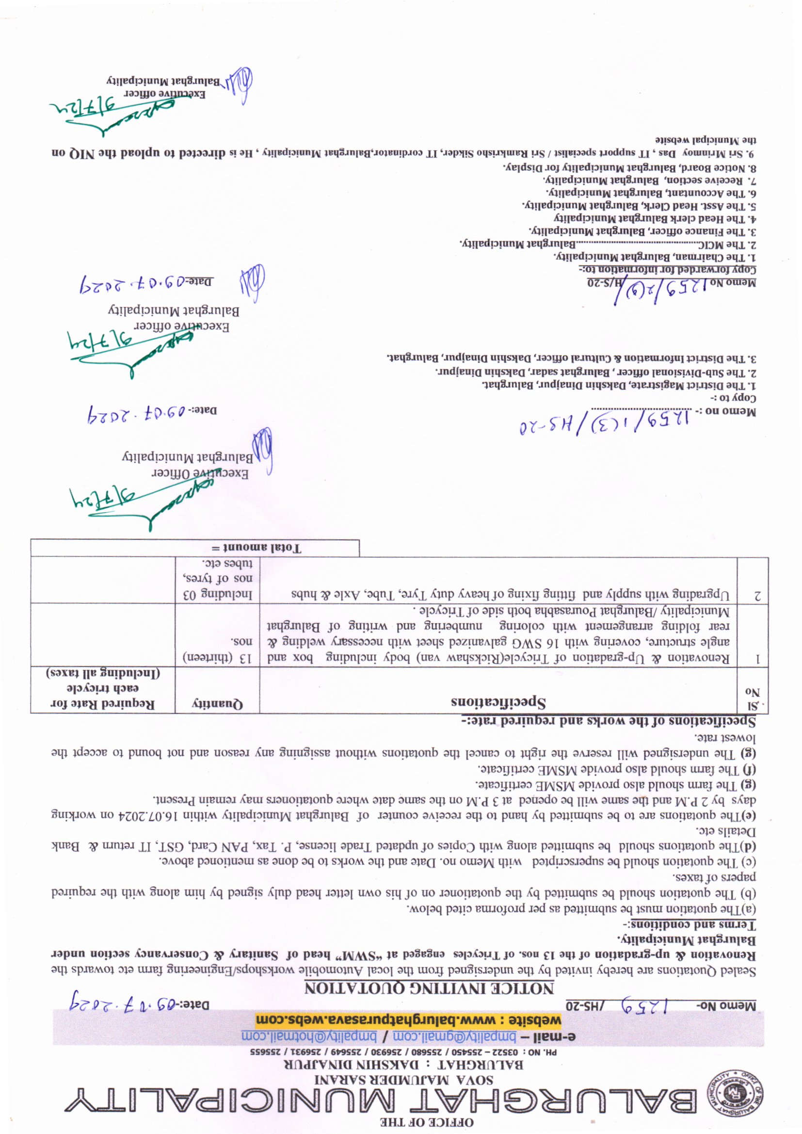 Memo No. 2150/HS-20 Dt. 10.09.2025, Renovating, upgrading works of 3 (Three) vehicles at SWM Head under Balurghat Municipality