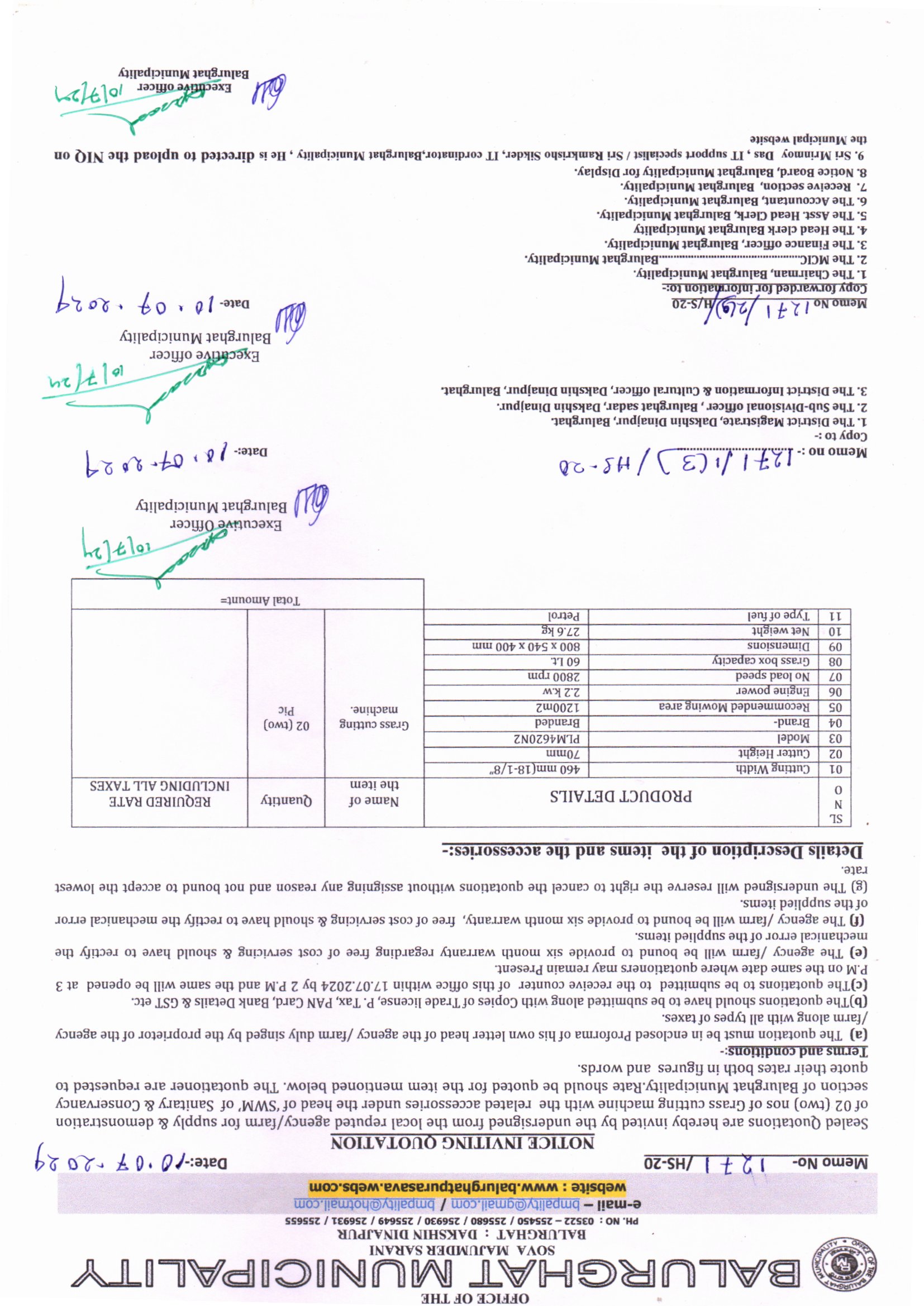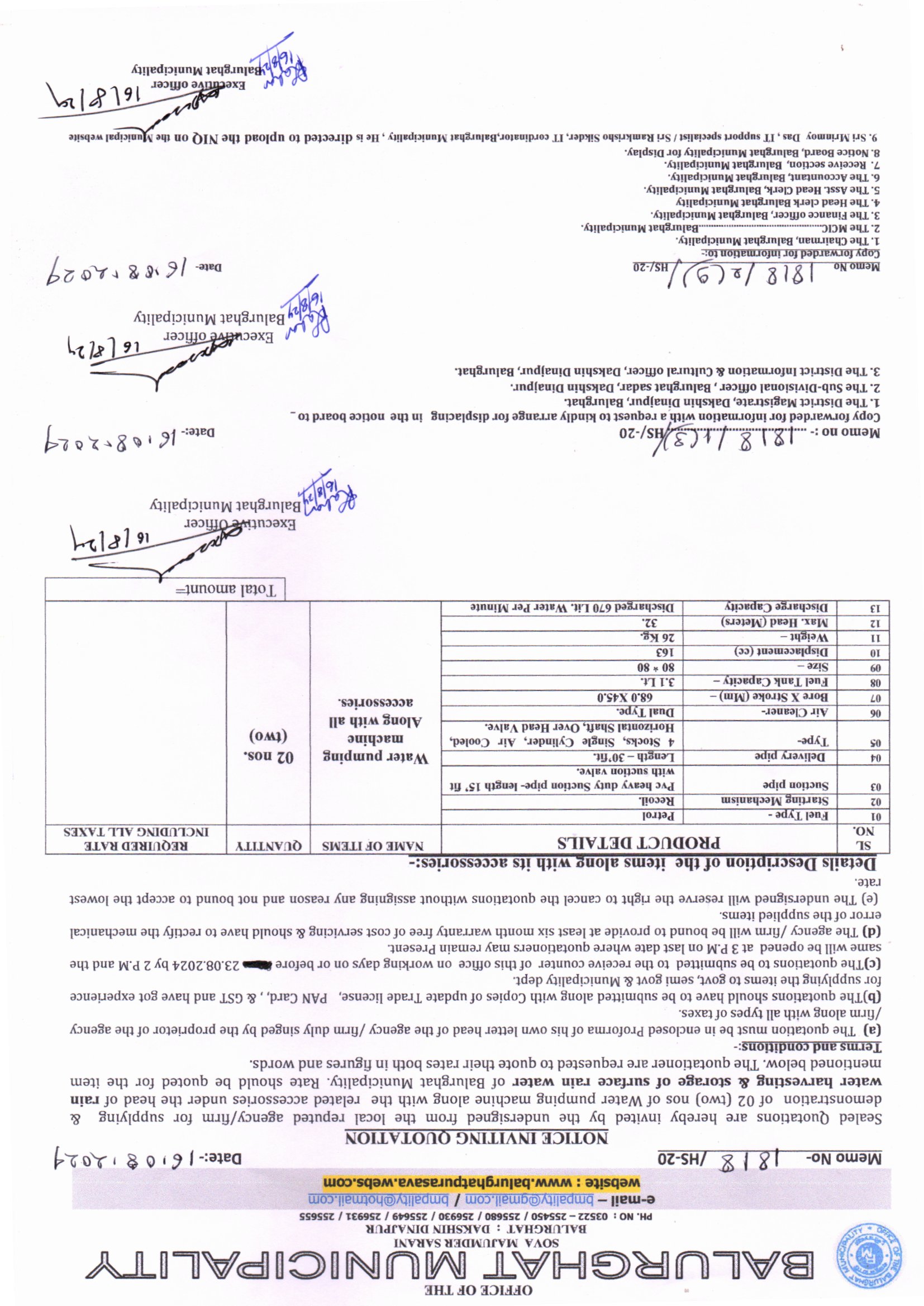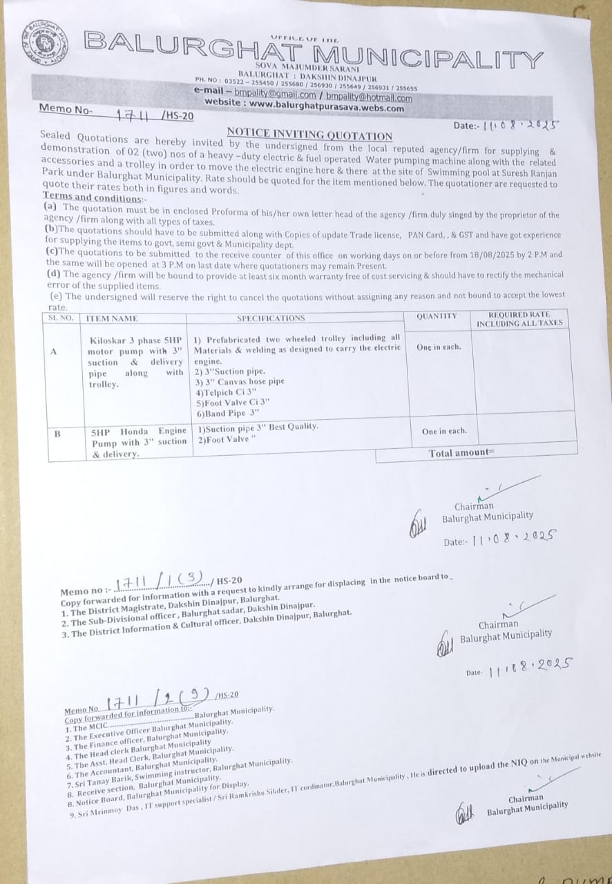 NIQ for Supplying and demonstration of 2 nos. of Water Pumping Machine along with the related accessories under Balurghat Municipality, Memo No. 1711/HS-20 Dt.11.08.2024