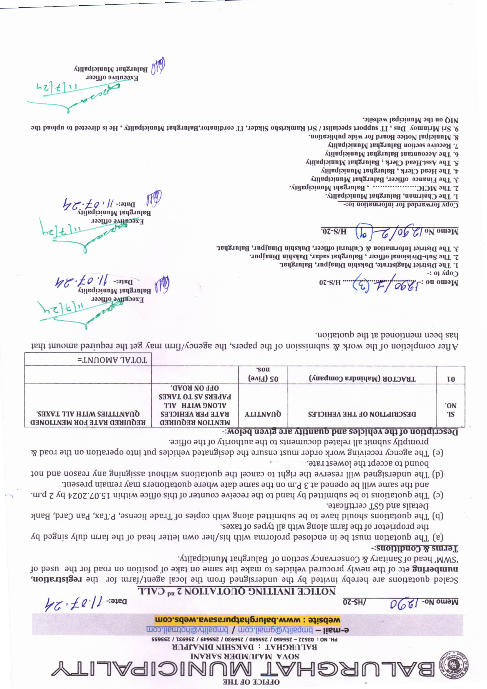 NIQ for renovating and upgrading works for NIQ mentioned Tractors under Balurghat Municipality, Memo. No. 3187/HS-20 Dt. 21.11.2024
