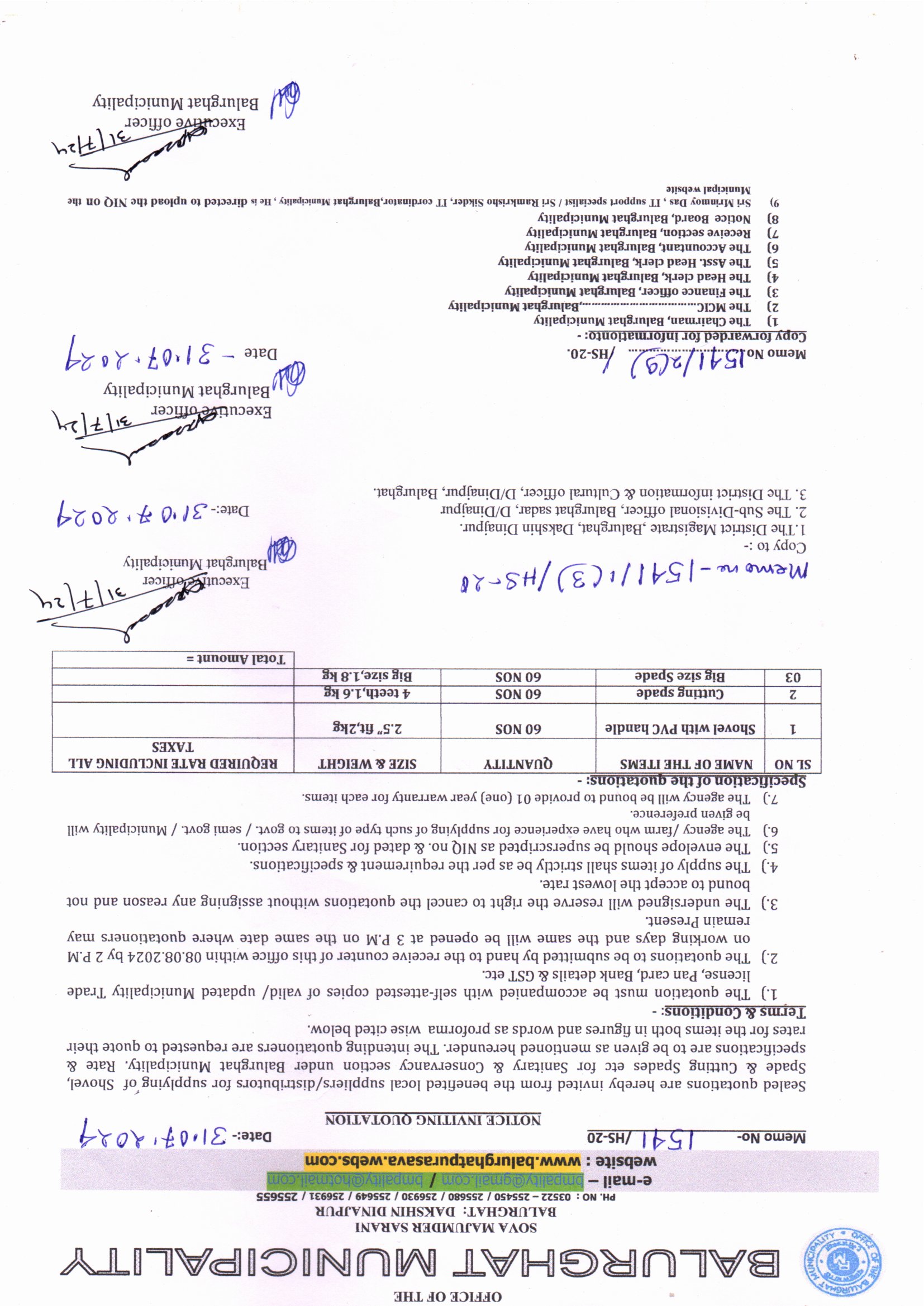 NIQ for Supplying of Hand Gloves, Fork Spade, Spade & Sickly (Hasua) for VCP ( SWM ) under Balurghat Municipality, Memo. 1638/HS-20 dt. 07.08.2025