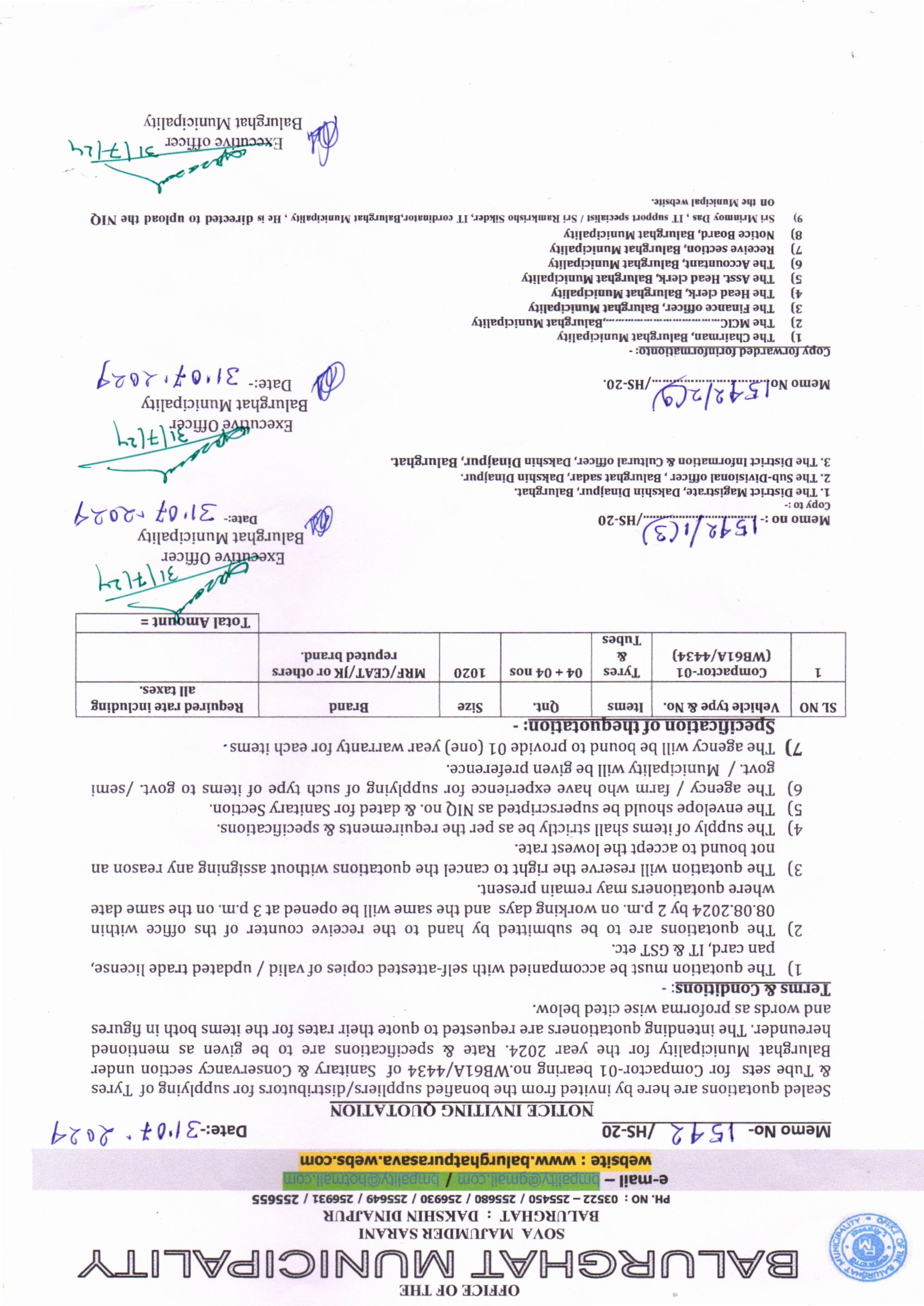 NIQ for supplying of 2 Tyres & Tube Sets for NIQ mentioned Compactor-1 under Balurghat Municipality, Memo. No. 3186/HS-20 Dt. 21.11.2024