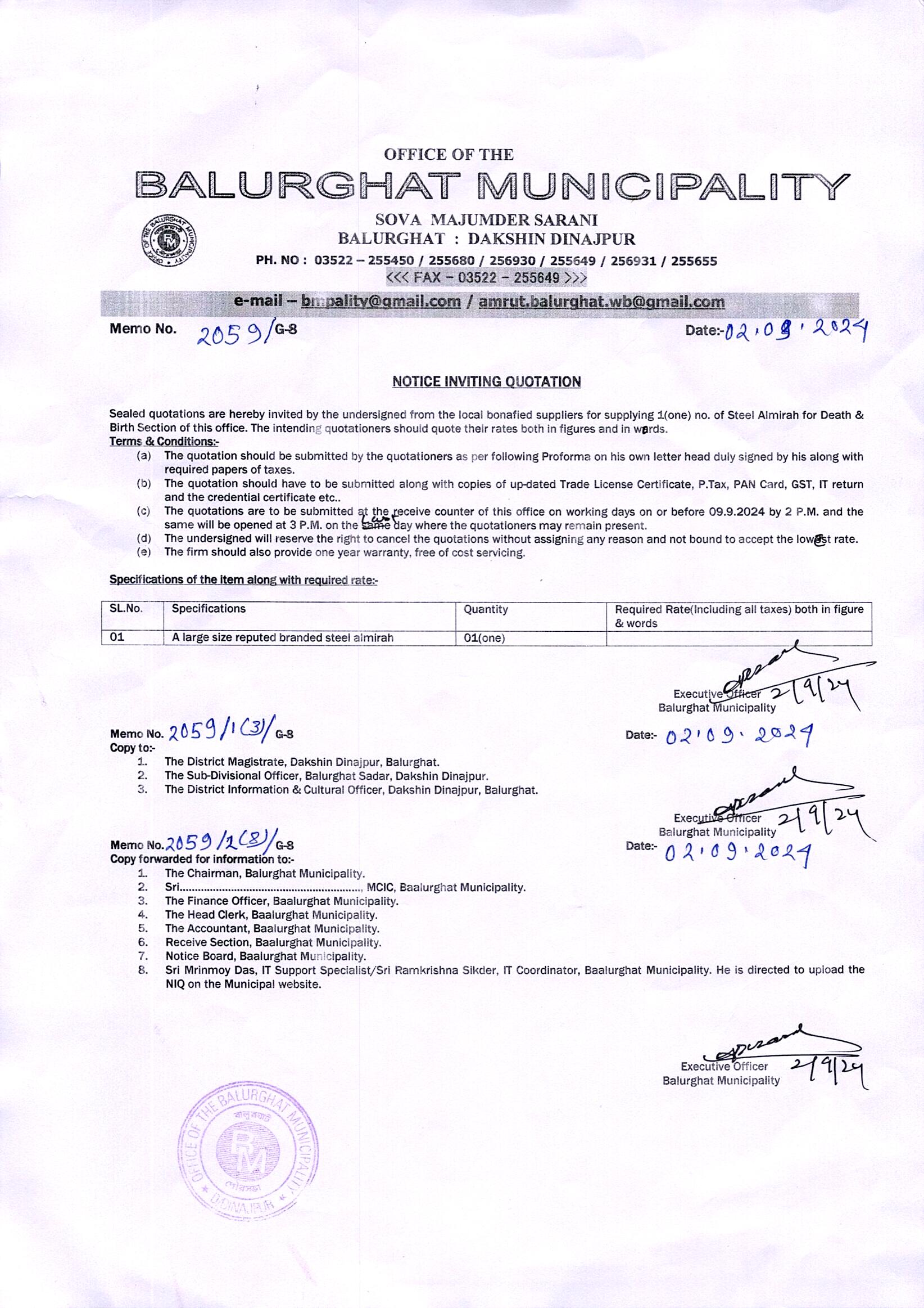 NIQ for Supplying 1 no. of Steel Almirah for Death & Birth Section under Balurghat Municipality