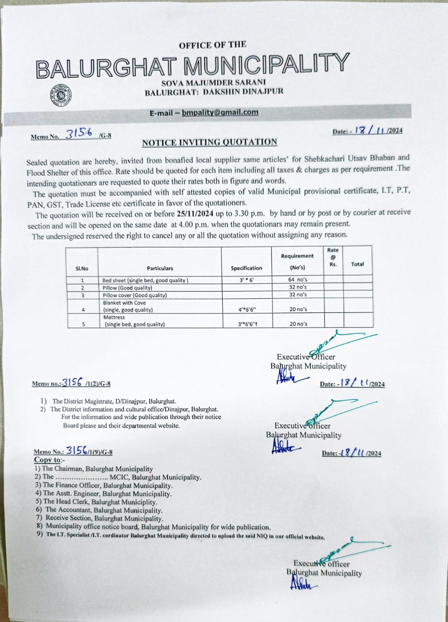 NIQ for supplying of Bed Sheet, Pillow, Pillow Cover, Blanket with cove and Mattress under Balurghat Municipality. Memo No. 3156/G-8 Dt. 18.11.2024