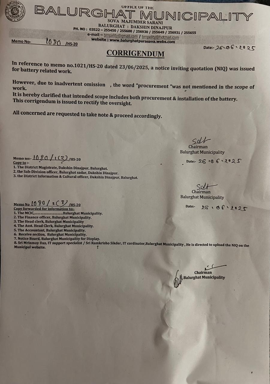NIQ for Supply of Mentioned Articles, Balurghat Municipality