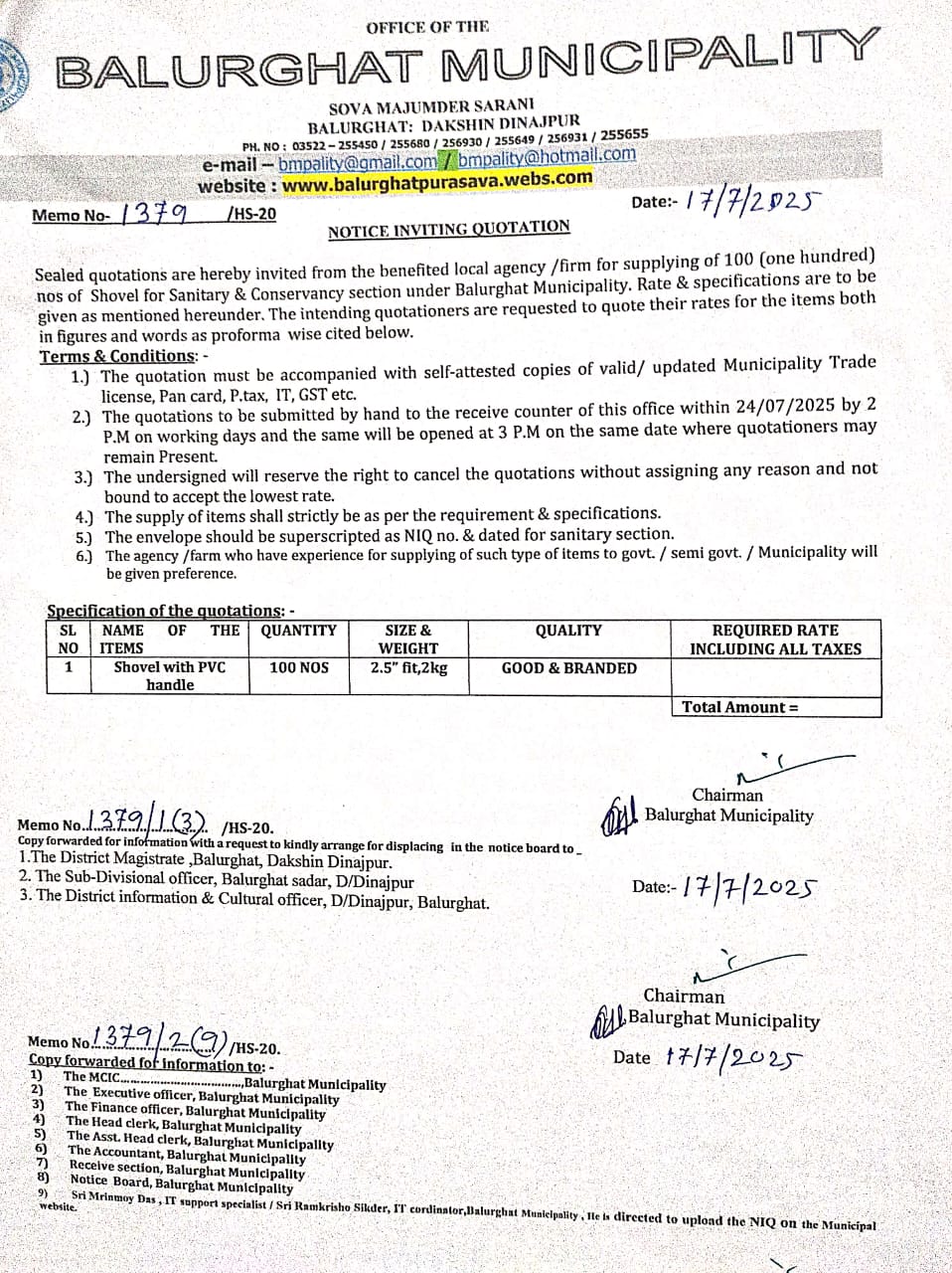 NIQ. for Supplying of 100 Nos. of Shovel under Balurghat Municipality